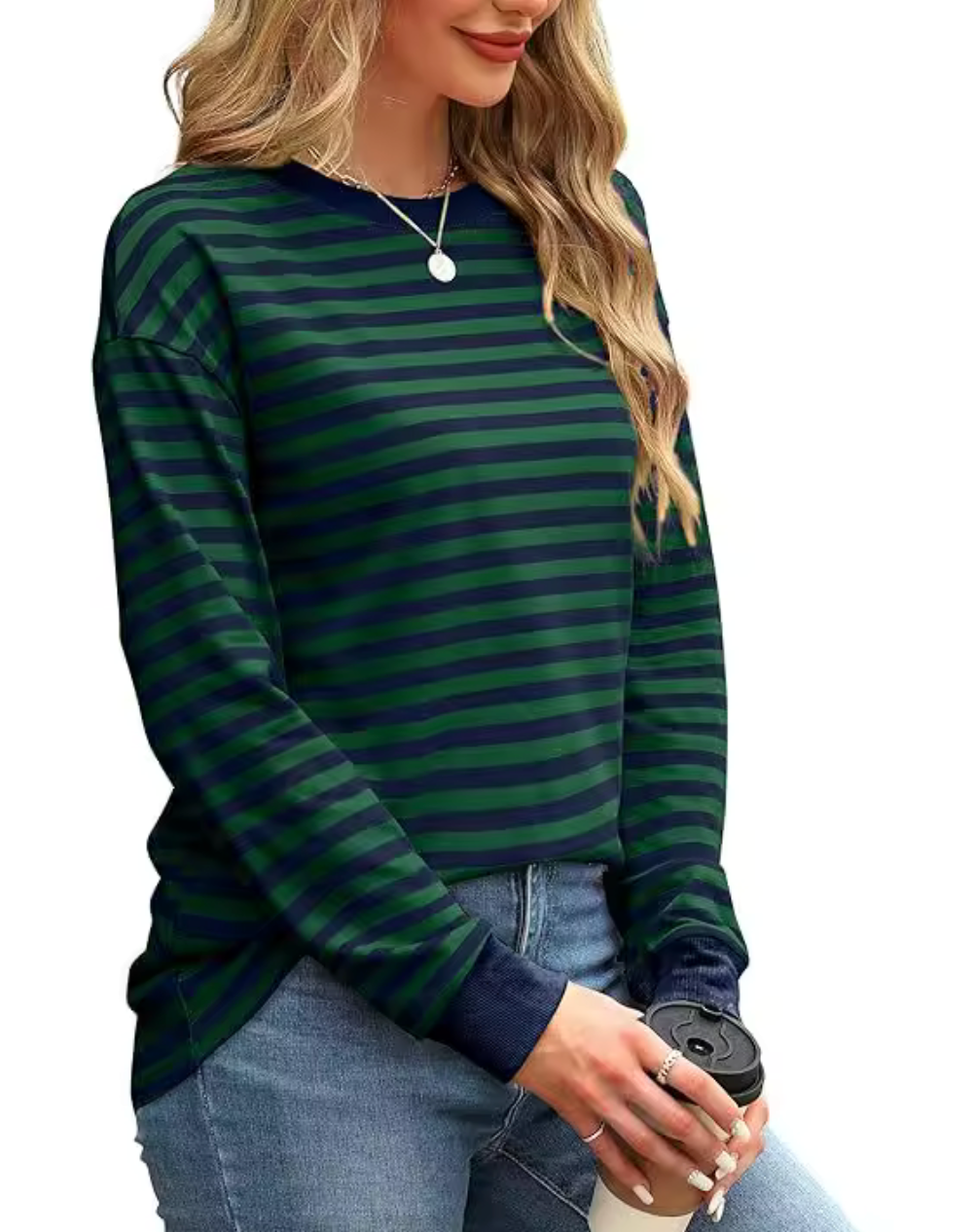 Features: Colorful stripes, crew neckline, and ribbed cuffs and hem